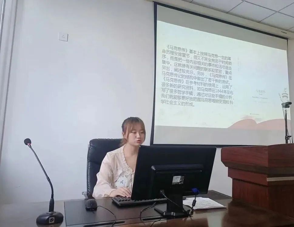 惠靖童同学以《读<马克思传>致敬伟大革命导师》为主题,围绕麦克莱伦的《马克思传》一书,对《马克思传》一书的目录、主要内容、重点细节等进行了讲述,介绍了马克思革命实践经历与思想历程的转变,并以马克思的墓志铭“哲学家们只是用不同方式解释世界,问题在于改变世界”为切入点,提到马克思不仅具有强烈的批判精神,更具有彻底的革命实践精神。