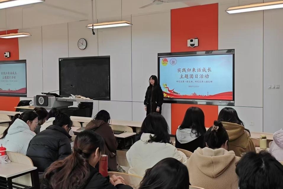 活动伊始,张典向同学们汇报了团支部参与寒假社会实践活动的情况。首先,她详细介绍了寒假社会实践活动的队伍立项情况、活动内容以及实际开展效果。紧接着,她强调了社会实践对提升同学们综合素质的重要性。最后,她向大家发出倡议,希望大家将寒假社会实践中的热情与责任延续到日常生活中,用实际行动践行青春誓言。