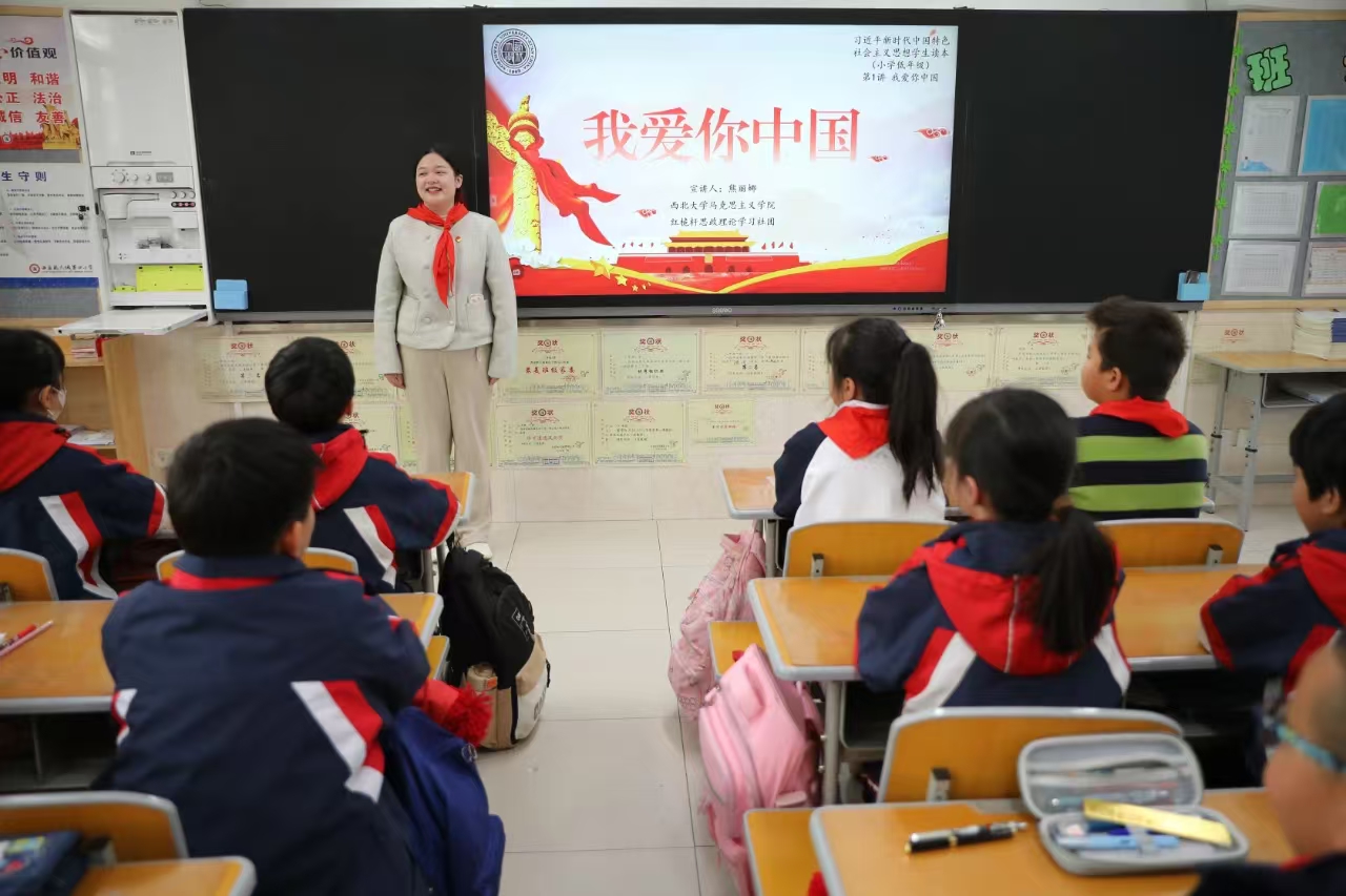 3月21日,我院红桅杆思政理论学习社团在西安航天城第四小学,以《习近平新时代中国特色社会主义思想学生读本》(小学低年级)为主要内容,为三年级的小学生讲授思政课。主讲人分别是来自2023级和2024级思想政治教育与中国近现代史基本问题研究专业的6名硕士研究生。