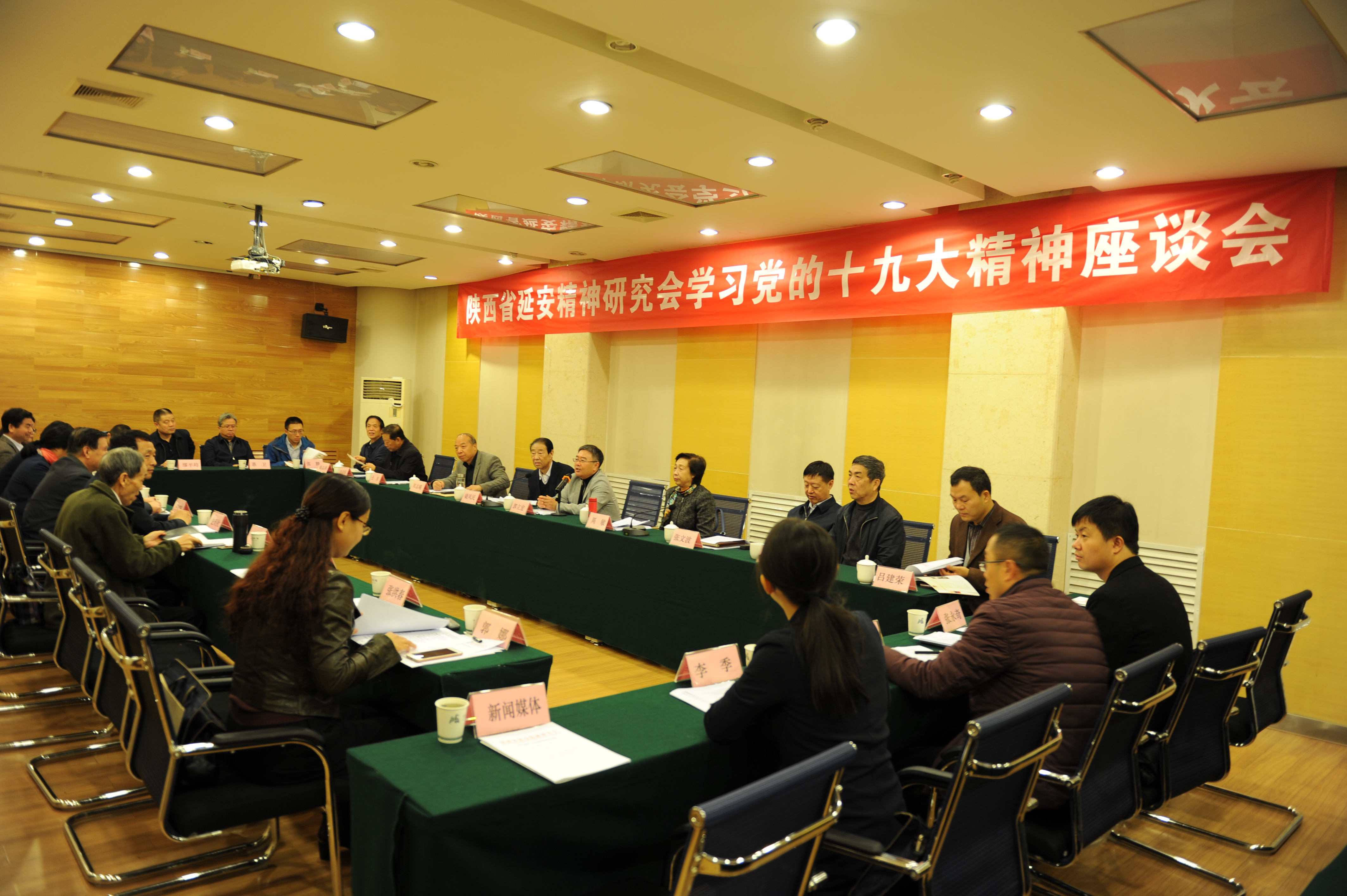 2017年10月26日上午,陕西省延安精神研究会学习党的十九大精神座谈会在我校太白校区举行,陕西省延安精神研究会会长、陕西省政协原副主席梁凤民主持座谈会,我校党委副书记、校长郭立宏应邀出席并致辞,校党委常委,党委办公室、校长办公室主任吕建荣,陕西省延安精神研究会副会长、研究员以及我院部分师生,新华社陕西分社、陕西日报社、陕西电视台、华商报、三秦都市报等新闻媒体记者50多人参加了座谈会。